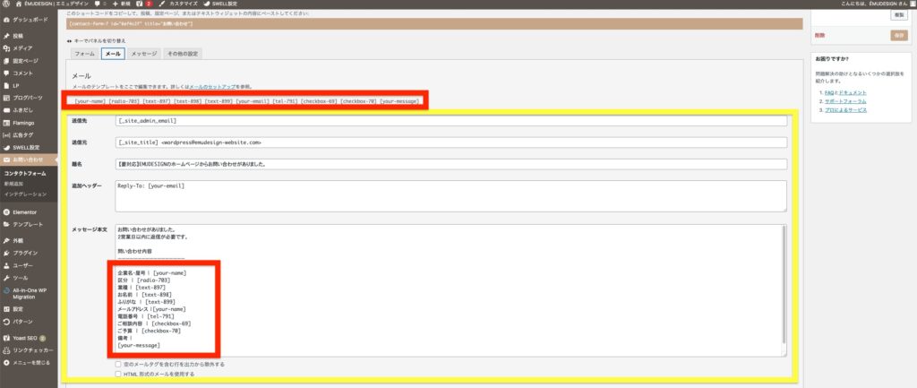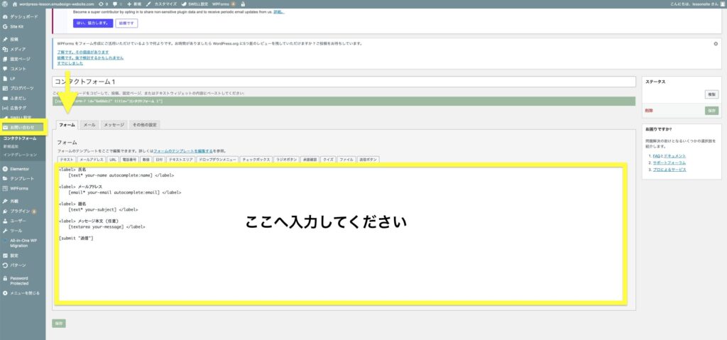 Contactform7について、コードの記載をしますが必ずしもこれ通りにしなければいけないというものではありません。大変有名で人気のプラグインですので調べればたくさんのコード、実装方法が出てきますのでそちらを使っていただいても大丈夫です!