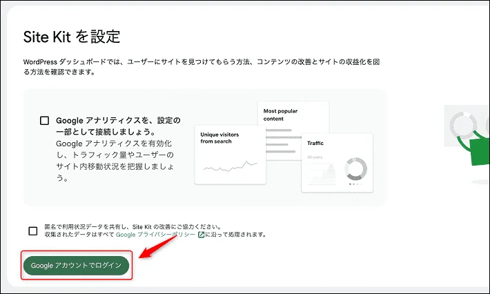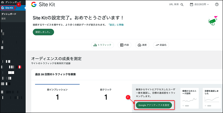 WordPressのダッシュボードよりSite Kitをクリックし、Googleアナリティクスを設定をクリックしてください。