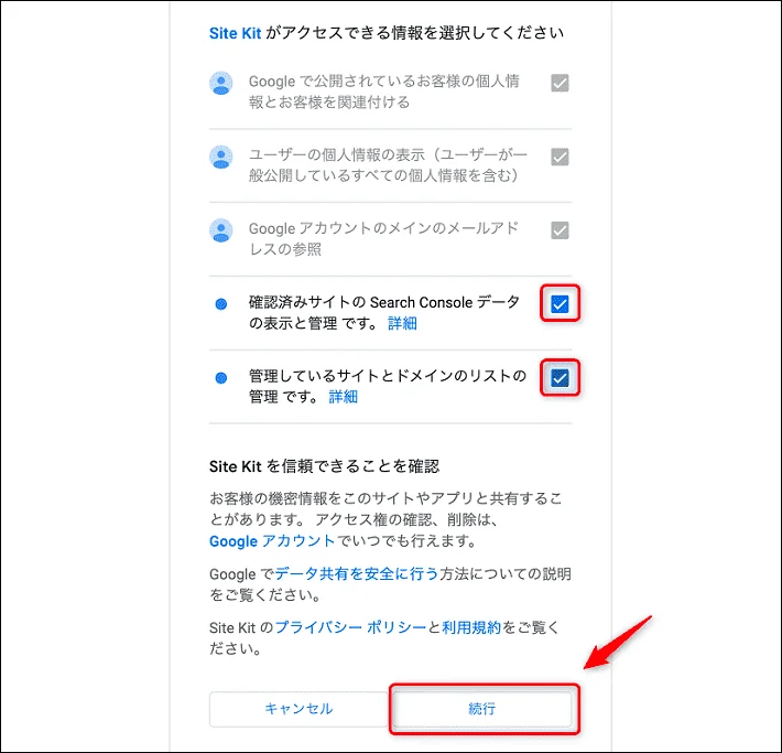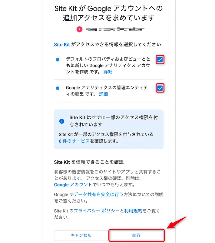 「SiteKitがGoogleアカウントへの追加アクセスを求めています」という画面になるので続行をクリックします。