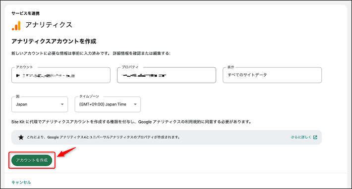 「アナリティクスアカウントを作成」という画面が表示されるので、アカウントを作成をクリックしてください。