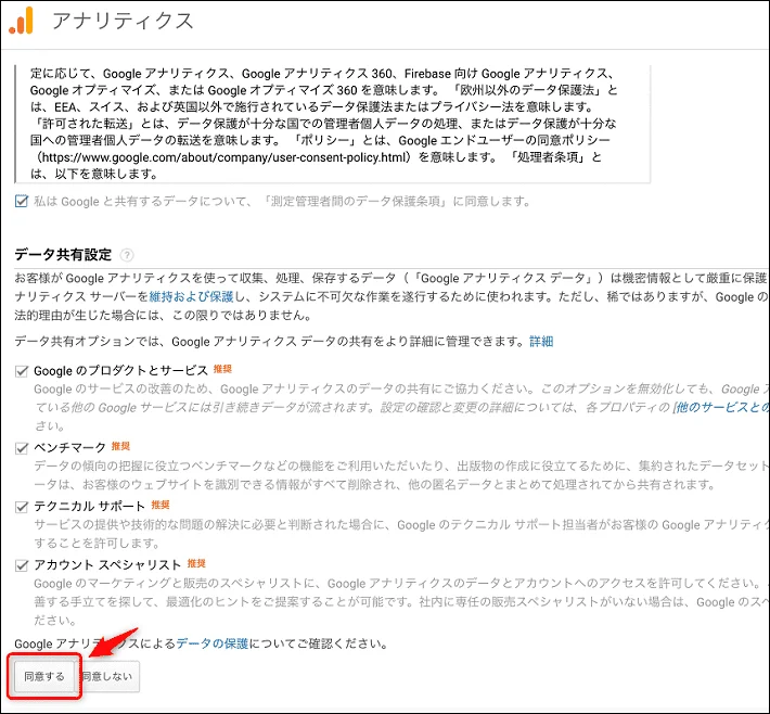 次に、アナリティクスの利用規約が表示されます。