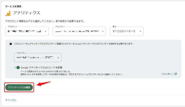 以下のような画面が表示されたら、確認したのちにアナリティクスの構成をクリックします。