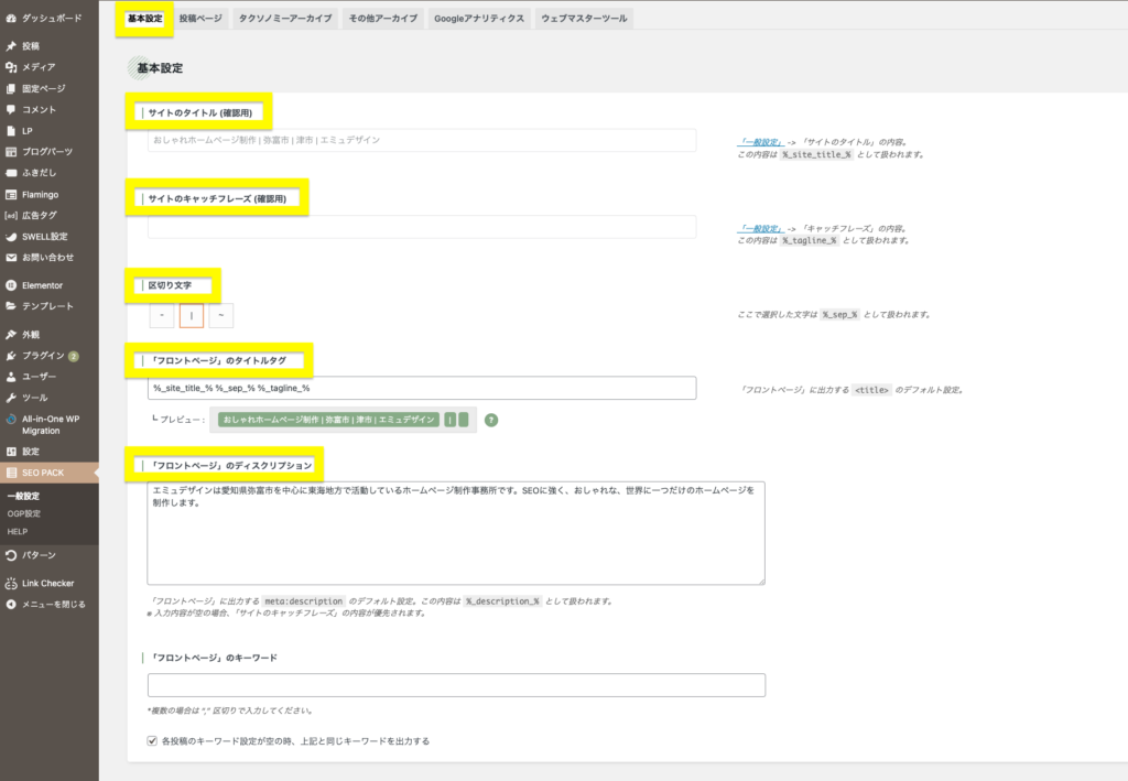 | 「フロントページ」のキーワード | キーワードを設定しても表示されないため空欄でOKです |