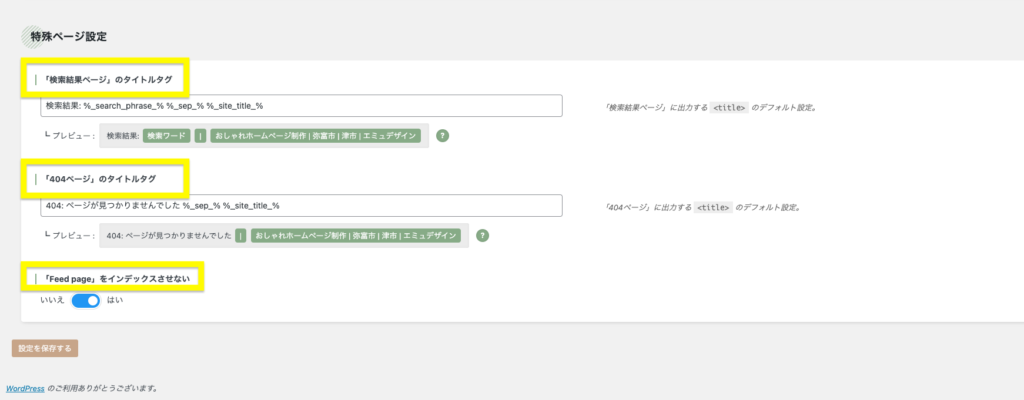 | 「Feed page」をインデックスさせない | 「はい」を選択 |