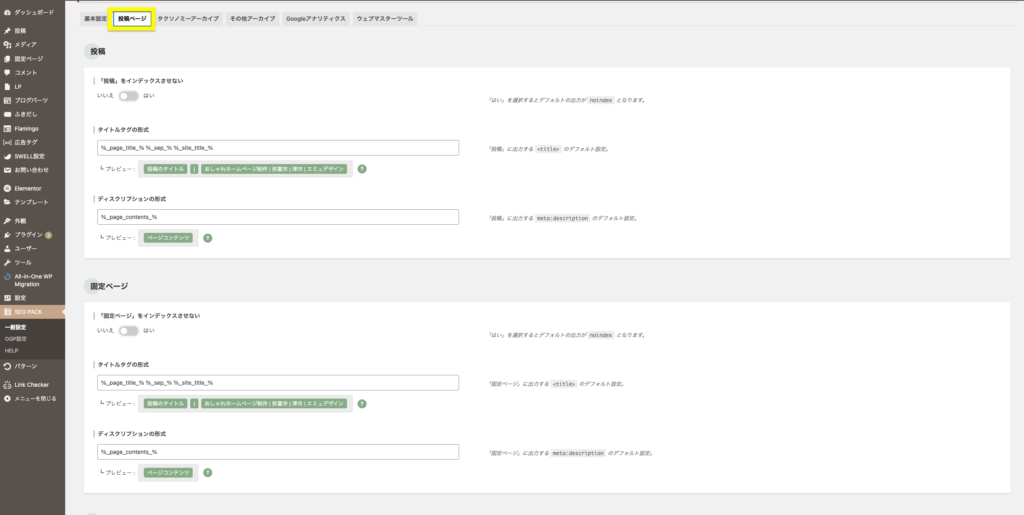 | タイトルタグの形式 | デフォルトのままでOK ⇒「固定ページのタイトル」「区切り文字」「ブログ名」の順で表示される |