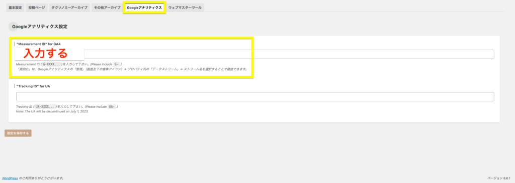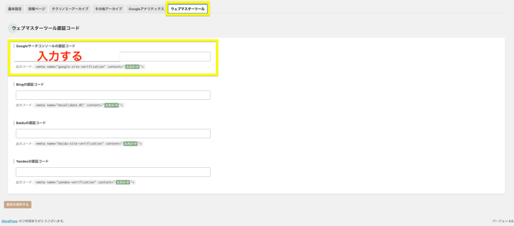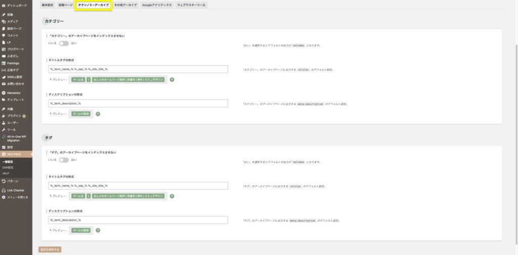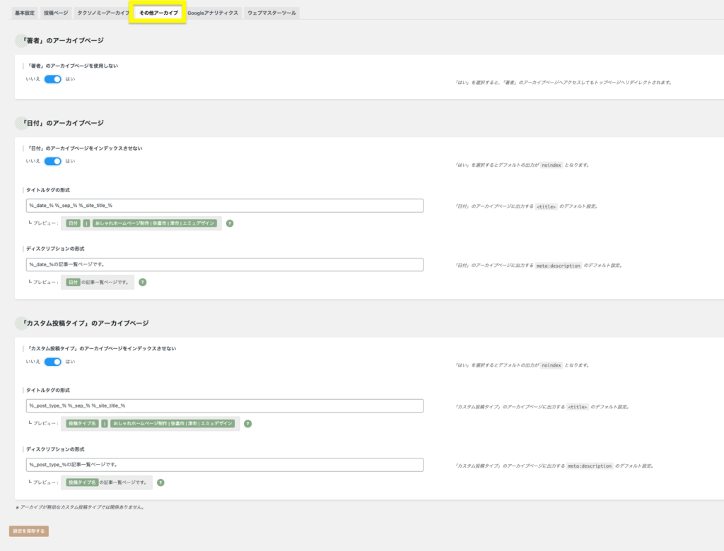 | 「タグ」のアーカイブページをインデックスさせない | 「いいえ」を選択 ⇒「はい」を選択するとタグページがインデックスされなくなる |